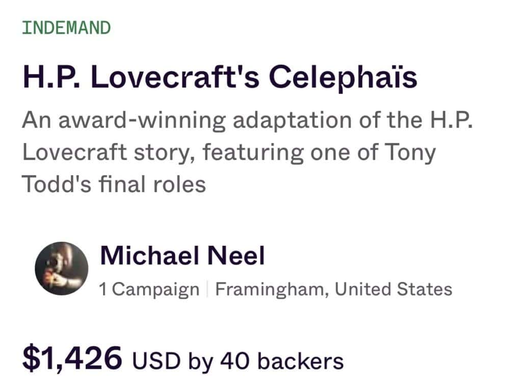 Thanks to everyone who contributed and donated to H.P. Lovecraft’s Celephaïs on Indiegogo. We hit our mark and then some: $1,426, which is 142% of our goal. Fantastic!